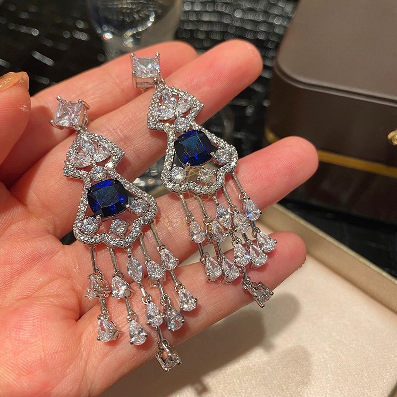 For a more dramatic look, blue earrings can be eye-catching. It is anti-tarnishing and anti-allergenic. Material: Alloy, cubic zirconia, 18k gold plated