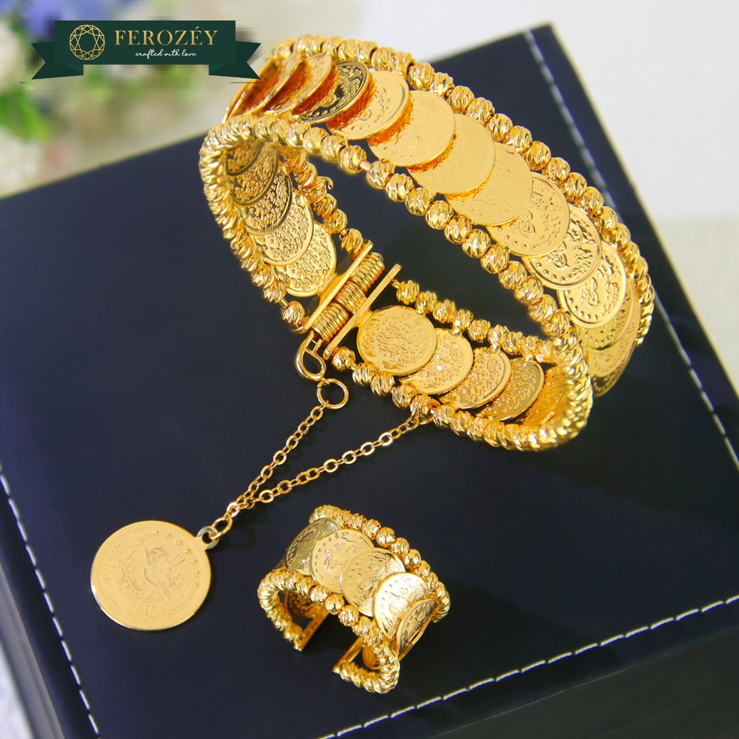 A bold coin-inspired bracelet and ring set with a rich gold finish,perfect for festive looks and statement styling. ✨